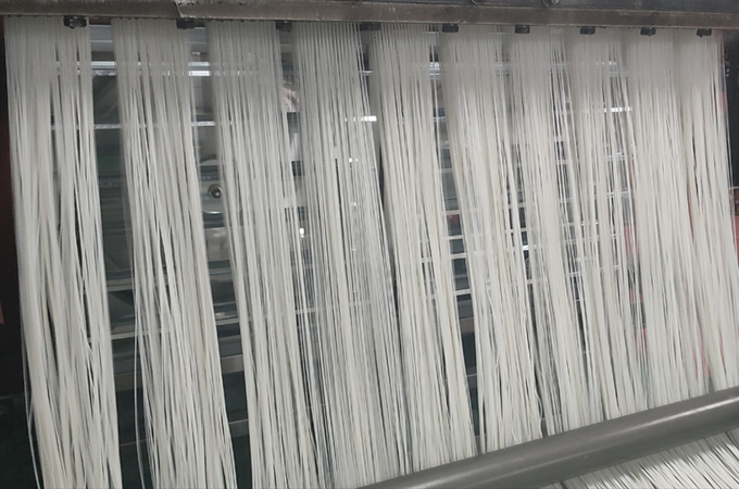 工藝流程:大米混配--加淀粉--粉碎/磨漿--調漿--熟化--擠絲--散絲攤薄--切斷--掛桿--老化--松絲--成品